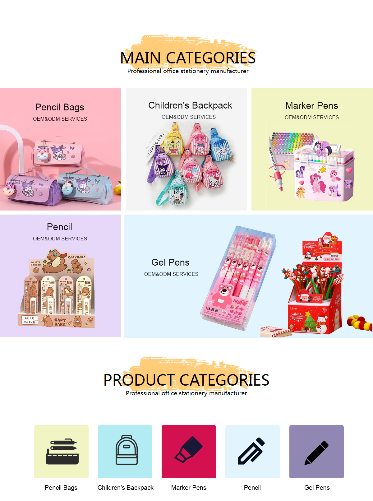 主な製品:マーカーペン、ローラーボールペン、ステッカー、バッグ、ペンケース